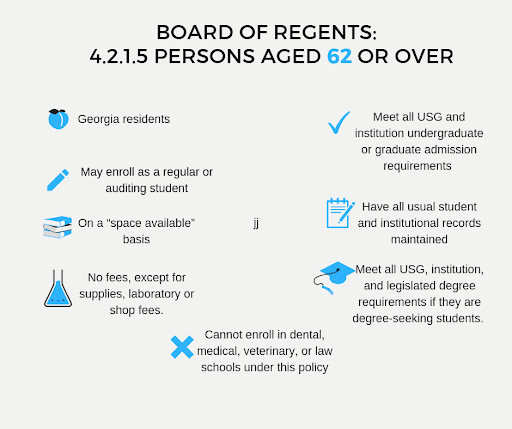 Reporter Blanca Lopez Olmedo depicts the requirements for adults age 62 and over who want to attend college in this infographic. Lopez used Canva and information from the Board of Regents to create this infographic.