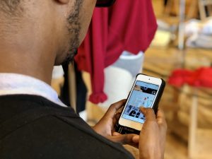 Stinson showing how the UO mobile app functions and its features. (Photo/Kyle B. Farrell)