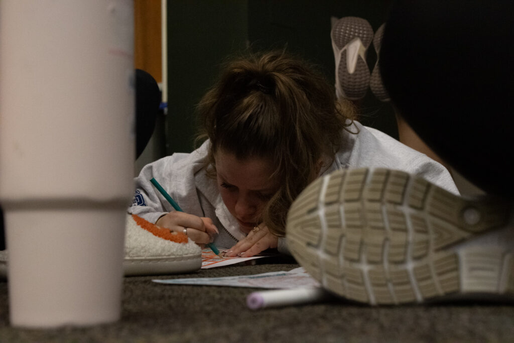 Starting at 10:30 p.m. that day, Taylor Swift fans and Junior Jewels members gathered in Zell B. Miller Learning Center. They played card games, did homework, bought Junior Jewels pins and made album bingo cards as they waited.
