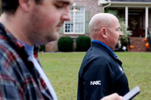 Justin Strength looks to see where the next house is while walking alongside Marcus Wiedower on Friday, November 2, 2018 in Watkinsville, Georgia. Wiedower is the Republican candidate running for State House in Georgia House district 119. (Emily Graven, emilyrgraven@gmail.com)