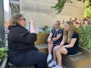 A 20-year-old rising college junior sits with a middle-aged woman on a sunlit Sunday afternoon in Copenhagen, Denmark. The two are in close contact, sitting only a foot across from each other on wooden platforms.